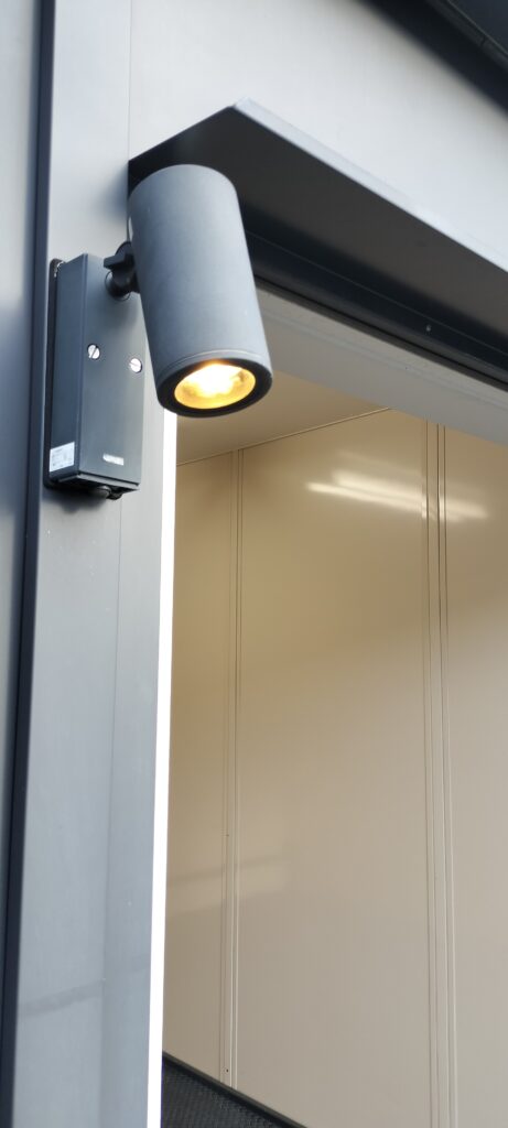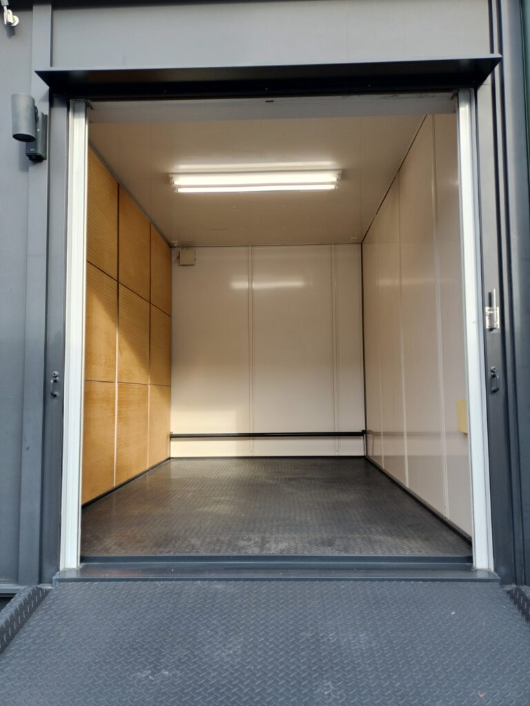 • 専用スロープ:倉庫一体型の大型鉄板スロープ。使用時はスロープをゆっくり手動で倒すだけ。未使用時は立てかけて、躯体と施錠すれば、防犯扉に早変わり。